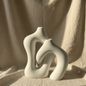 Dos jarrones con forma escultórica que se entrelazan visualmente cuando se ponen juntos. Sus curvas abiertas y los huecos que las atraviesan crean sombras distintas según la luz del día. Una composición que cambia dependiendo de cómo y dónde la pongas.