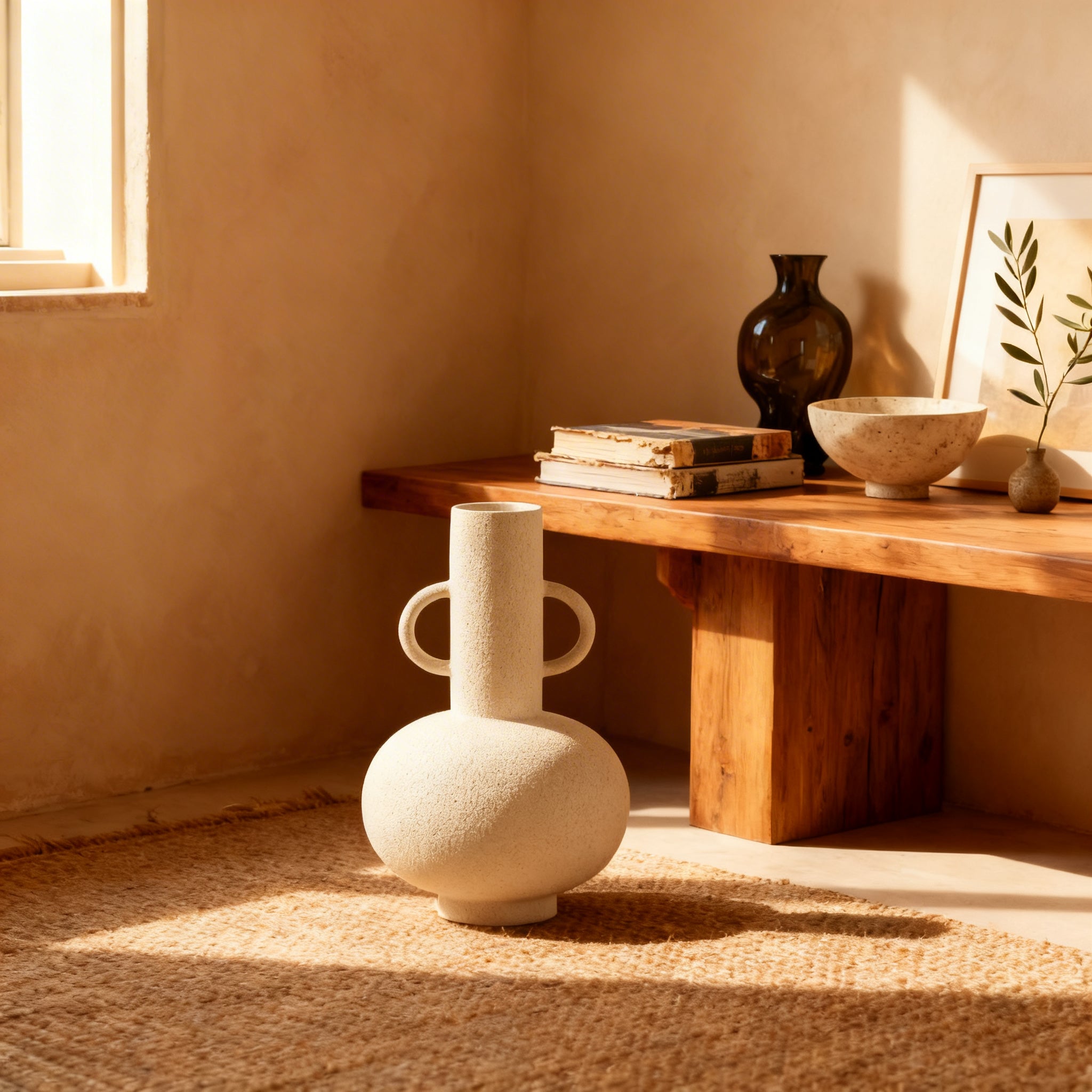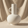 El Vaso Marfim combina un cuerpo redondo y generoso con un cuello largo y cilíndrico, y dos asas circulares a los lados que le dan ese toque de ánfora moderna. Es de los jarrones más grandes de la colección y tiene suficiente presencia para ser la pieza principal de cualquier rincón.