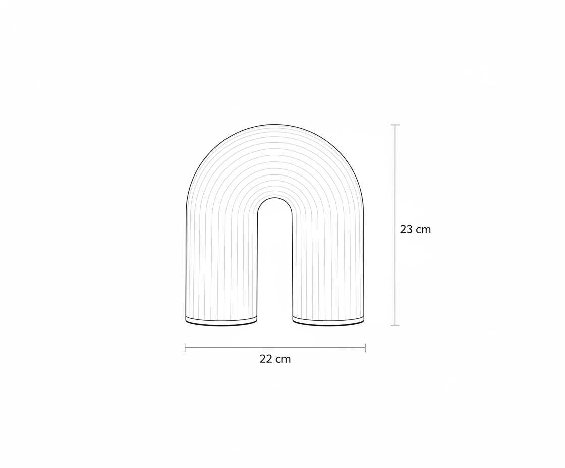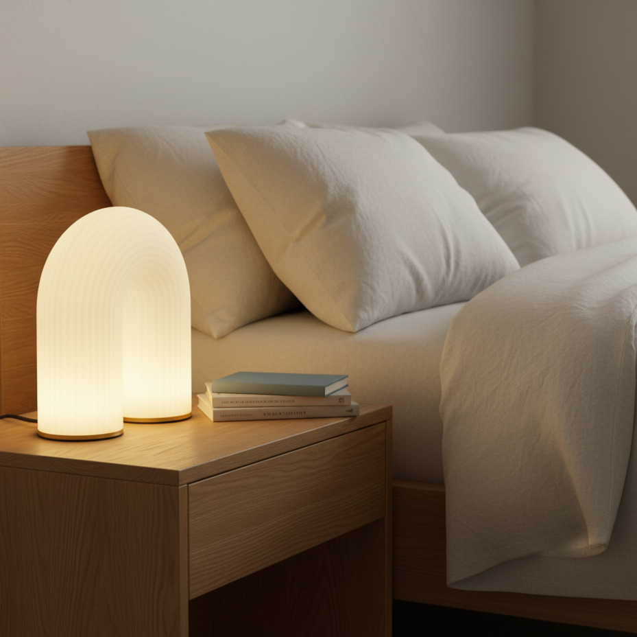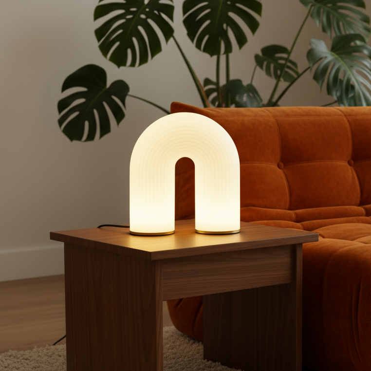 ARLÉA es una lámpara de mesa moderna hecha en acrílico translúcido, con forma de arco y luz cálida.