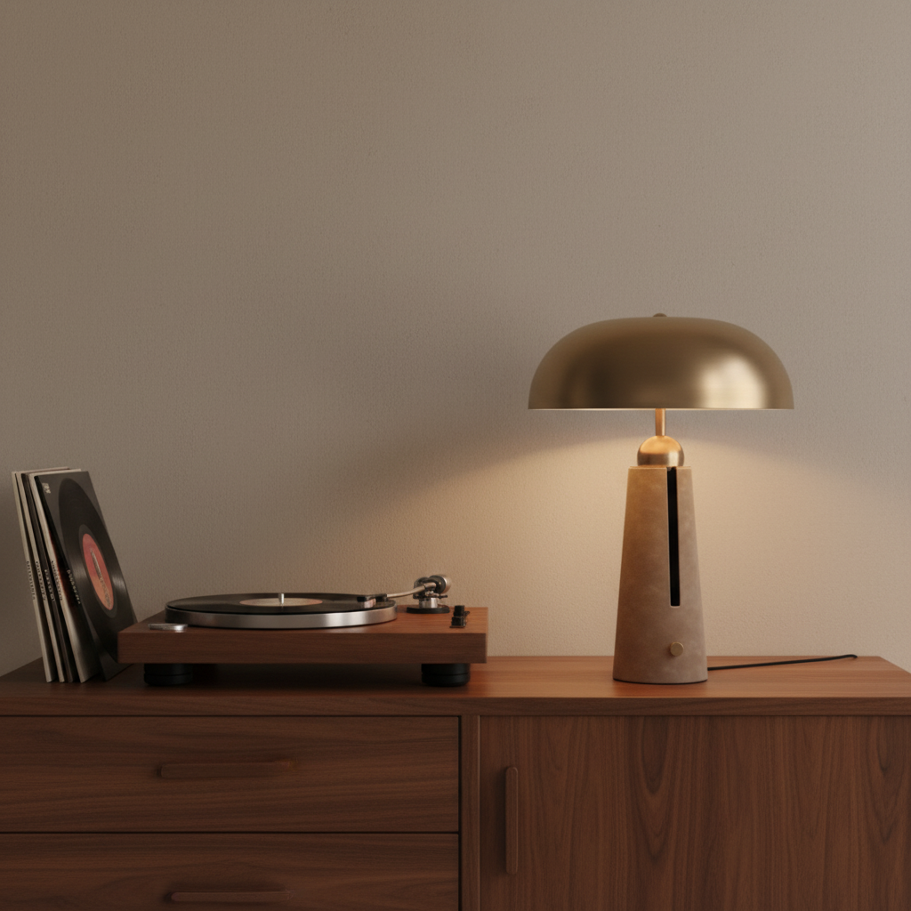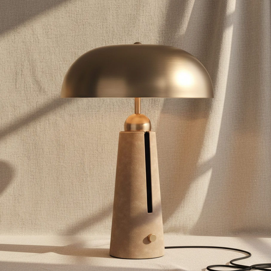 ARUNA es una lámpara de mesa en cuero natural, pensada para crear ambientes cálidos y con textura.