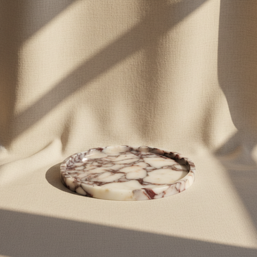 Calacatta Viola Tray está hecha en mármol italiano Calacatta Viola, conocido por su base crema y sus vetas en tonos vino, violeta y burdeos.
