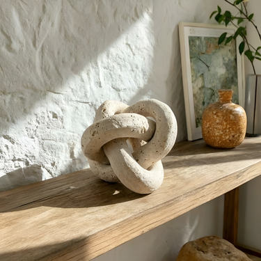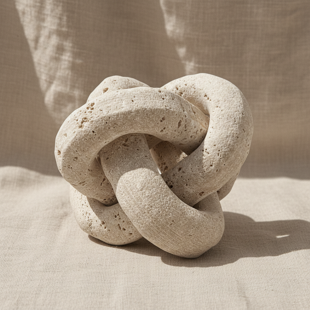 Ideal para mesas de centro, estanterías o superficies de apoyo, el Nudo Travertino funciona tanto como pieza única como en composición con otros objetos decorativos. Cada pieza presenta vetas y variaciones propias del travertino, haciendo que cada nudo sea único y resalte la belleza natural de la piedra.
