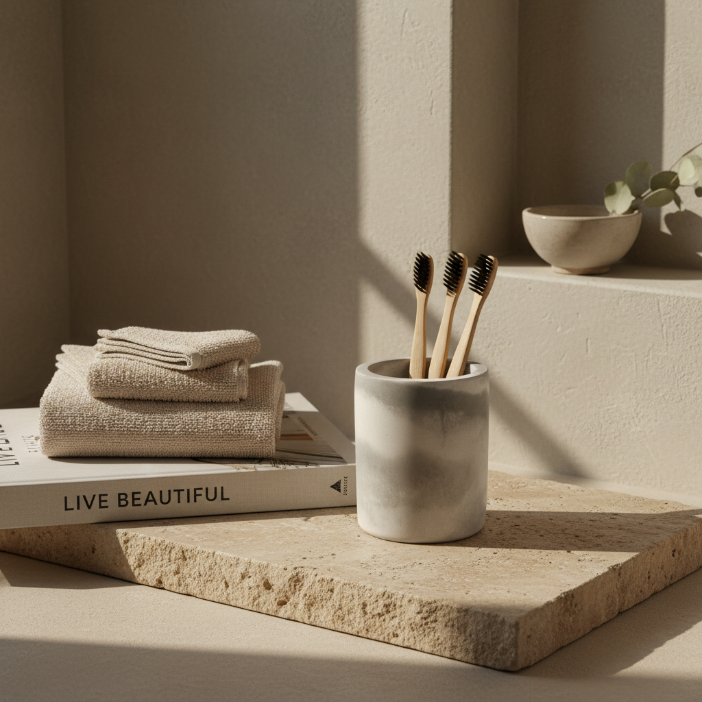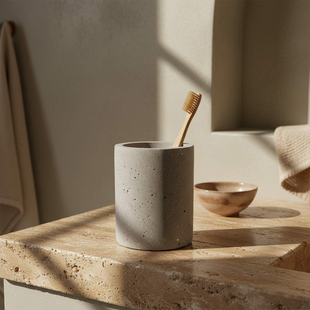 Pensado para quienes prefieren objetos honestos, táctiles y de inspiración arquitectónica, el Bruto Tumbler funciona como porta cepillos, vaso organizador o contenedor decorativo para rutinas diarias. Una pieza funcional que eleva el baño con una presencia serena, moderna y atemporal.